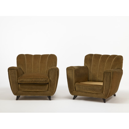 (attribuito) Coppia di poltrone imbottite con struttura in legno e rivestimento in velluto color senape. Gambe tornite in legno. Esecuzione italiana anni 40. (cm 93x76x90) (lievi difetti, mancanti di un cuscino)