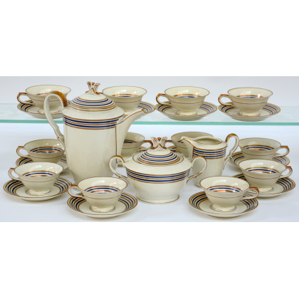 Manifattura tedesca Volkstedt Elfenbein, anni '40. Servizio da caffè in porcellana con decoro in oro e blu composto da dodici tazzine, lattiera, caffettiera, zuccheriera.