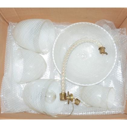 Cartone contenente parti di un lampadario di Murano con coppe in vetro a reticella e braccia a torciglione. Anni 50 (difetti e mancanze)