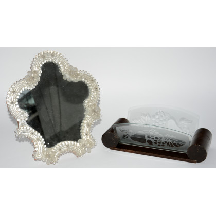 Portafrutta in legno e vetro sabbiato di epoca Déco, unito a un piccolo specchio di manifattura muranese. (misure diverse) (difetti)