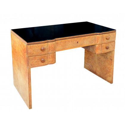 Scrivania in stile "Novecento", impiallacciata in radica con quattro cassetti e piano in opalina nera. Esecuzione italiana, anni 30.
