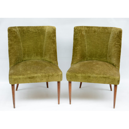 Coppia di poltroncine imbottite in legno con gambe troncoconiche inflesse. Rivestimento in velluto verde. Italia, anni 40 (lievi difetti) (cm 58x81x68)