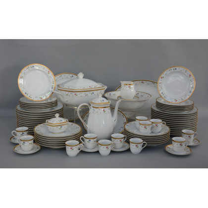 Manifattura tedesca. Servizio in porcellana bianca decorata a motivi floreali e profilata oro composto da: ventiquattro piatti piani, dodici piatti fondi, dodici piattini, due piatti da portata, antipastiera, insalatiera, zuppiera con coperchio, caffettiera, lattiera, zuccheriera e dodici tazzine con relativi piattini.