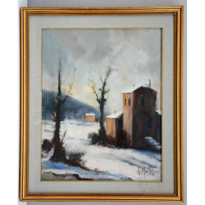 Ignoto, "Paesaggio invernale", olio su masonite (cm 60x48) recante firma "A Mutti" in basso a destra. In cornice