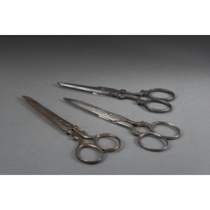 Lotto composto da tre forbici in ferro del secolo XIX, a decori diversi