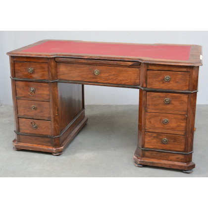 Scrivania da centro lastronata in palissandro con quattro cassetti in linea sui due lati e uno centrale, piano in similpelle rossa, piedi a cipolla (cm 148x84x76) (difetti e mancanze)