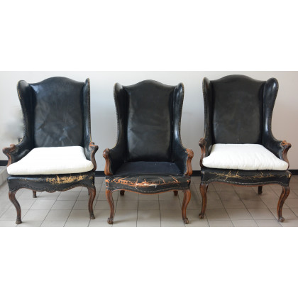 Gruppo di tre antiche poltrone ad orecchioni con braccioli e gambe sagomate ed intagliate rivestite in pelle nera (difetti)