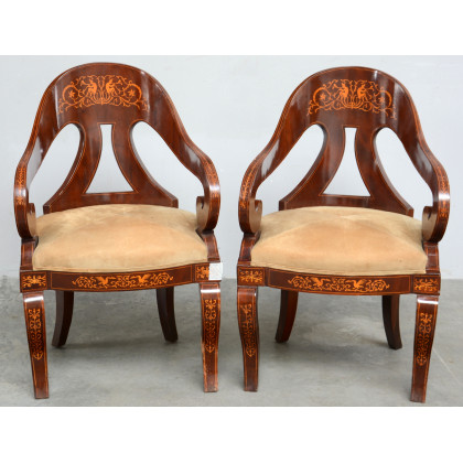 Coppia di antiche poltrone con schienale a gondola impiallacciate in mogano con intarsi in acero, braccioli desinenti a ricciolo, seduta rivestita in alcantara (difetti e restauri)