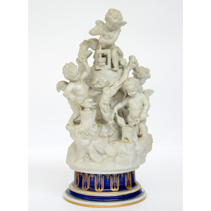 Manifattura di Sevres "Putti Allegorici", sec. XX. Gruppo scultoreo a bisquit su base in porcellana blu con fregi dorati.