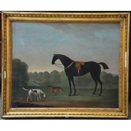 Scuola inglese sec. XIX, "Cani e cavallo in un paesaggio" olio su tela (cm 60x80) in cornice dorata (difetti e restauri)