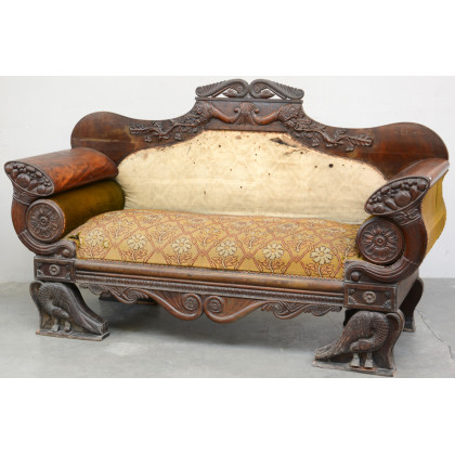 Divano in noce con schienale sagomato ed intagliato ad animali fantastici e cornucopie, montanti mossi scolpiti a frutti e medaglioni, fascia sagomata decorata a volute, piedi intagliati a volatili. Sec. XIX