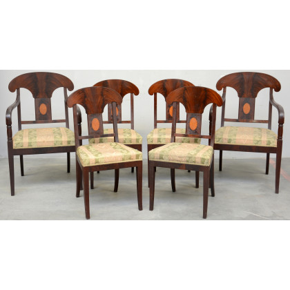 Fornitura da sala da pranzo in noce con schienale sagomati intarsiati a motivo stilizzato, composto da due poltrone e quattro sedie. Inghilterra, sec. XIX