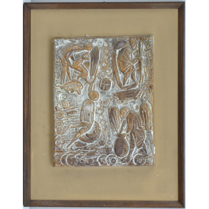 Placca in terracotta smaltata in bicromia a figure e ad animali. Italia, anni 50 (cm 30x23) (difetti)