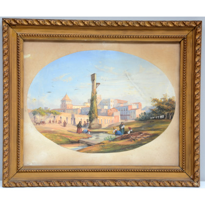 Scuola napoletana "Paesaggio con figure" tempera su carta ovale (cm 34x50) in cornice