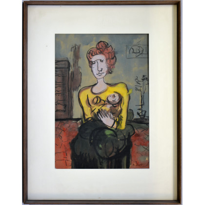 Firma indecifrata "Mamma con Bambino" acquerello su carta (cm 47x32) firmato in basso a destra. In cornice