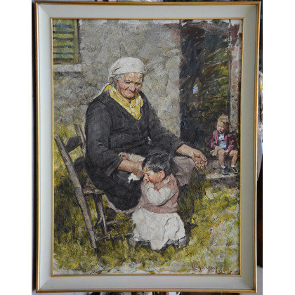 "La nonna e i bambini" olio su tela (cm 145x107) firmato e datato in basso a destra, in cornice (lievi difetti)