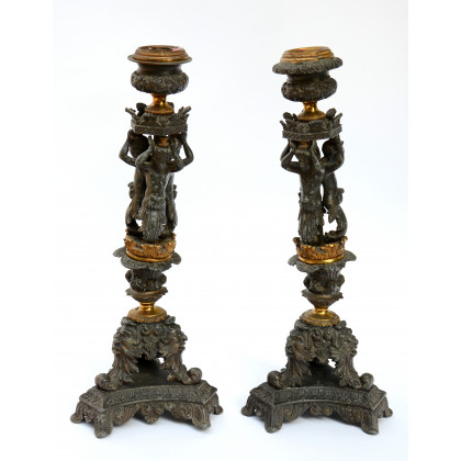 Coppia di candelieri a una luce in metallo verniciato nero su base tripode con telamoni che reggono il porta cero (h cm 47) (difetti)