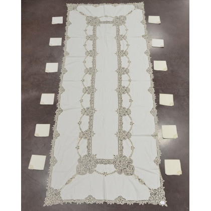 Lotto composto da una tovaglia rettangolare in lino color creme con ricamo e pizzo Rinascimento e dodici tovaglioli. Sec. XX (cm 400x160) (difetti, macchie) Lot comprising a linen rectangular tablecloth and twelve napkins, 20th century (defects and stains)