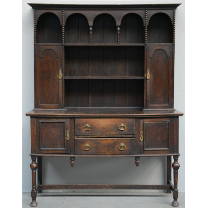 Credenza in rovere di struttura architettonica con due cassetti, quattro ante e vani a giorno (cm 153x199x56) (difetti)