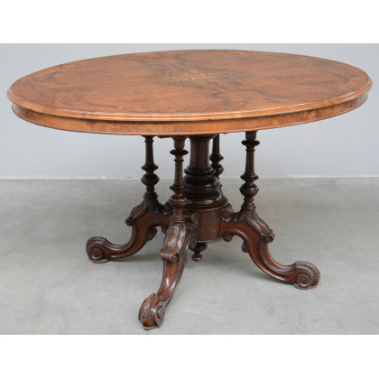 Tavolo da centro con piano ovale intarsiato e sostegno a balaustro con colonnine tornite (cm 134x78x102) (difetti)