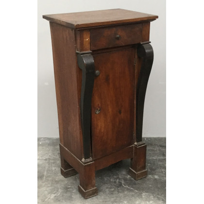 Comodino ad un anta e un cassetto, montanti sagomati ed ebanizzati, piedi a pilastro, secolo XIX (difetti)