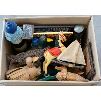 Cartone contenente numerosi oggetti in legno e materiali diversi a cui si aggiunge un teatrino assemblabile in cartone (difetti)