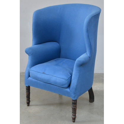 Poltrona a pozzetto con gambe anteriori tornite e posteriori sagomate. Sec XIX. Rivestite in tessuto azzurro