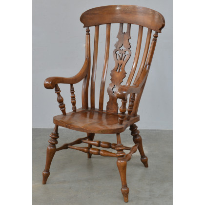 Poltrona in legno con schienale a listelli, braccioli e supporti torniti (difetti)