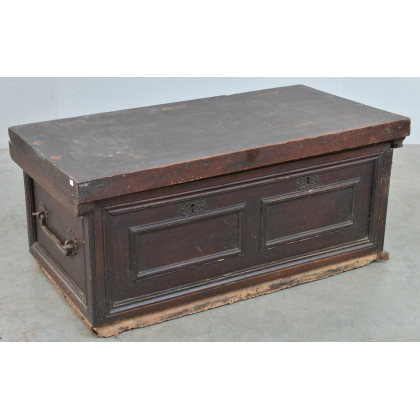 Antico cassone in noce con piano intarsiato in legni chiari (cm 117x54x60) (gravi difetti)