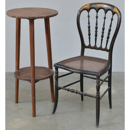 Lotto composto da una sedia in legno ebanizzato decorata in policromia e dorature a fiori e volute e un tavolino. Sec. XIX (difetti)