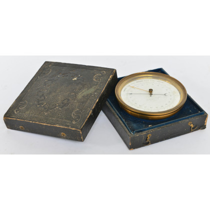 Barometro da viaggio in ottone. Francia, inizio sec. XX. In custodia in pelle impressa (difetti)