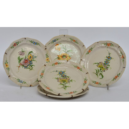 Manifattura di Imola. Gruppo di cinque piatti in maiolica decorato in policromia a fiori (d. cm 22) (difetti) RITIRA