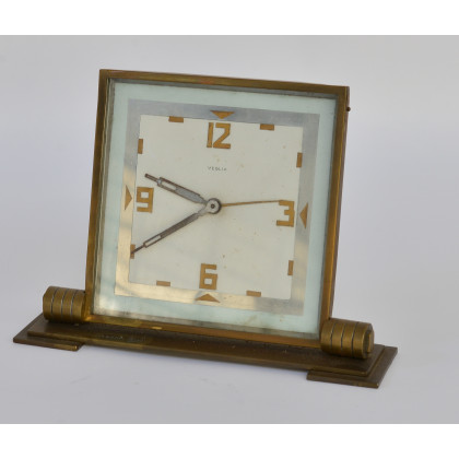Orologio da tavolo in ottone con quadrante a smalti e numeri arabi. Marcato Vegli. 1940 circa (difetti e mancanze)