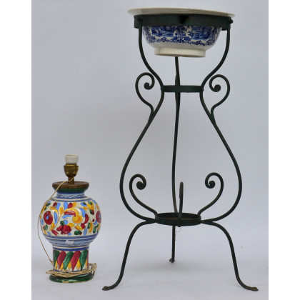 Lotto composto da una lampada con corpo in ceramica e un bacile in ceramica con base in ferro battuto