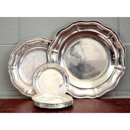 Lotto composto da dodici piattini e due piatti grandi in argento a bordo sagomato (gr 1750 ca)