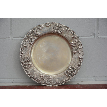 Piatto tondo in argento con bordo sbalzato, cesellato e inciso a volute, fiori e motivi vegetali (gr 450 ca) (d cm 30)