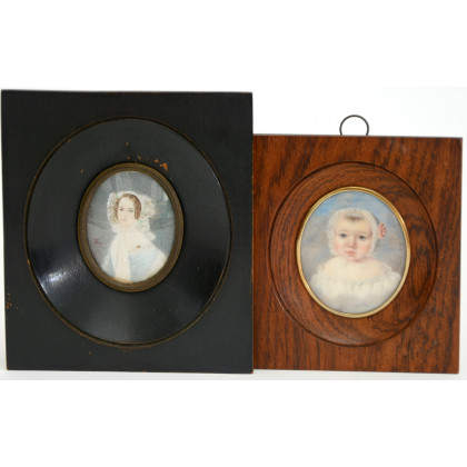 Lotto di due miniature ovali raffiguranti gentildonna e neonata, misure diverse in cornici