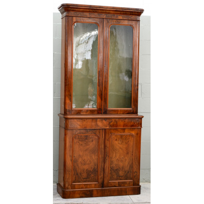 Vetrina a due corpi lastronata in noce, radica e piuma di noce. Parte superiore a due ante a vetri, parte inferiore a un cassetto e due ante riquadrate. Fine sec. XIX (cm 108x235x41)