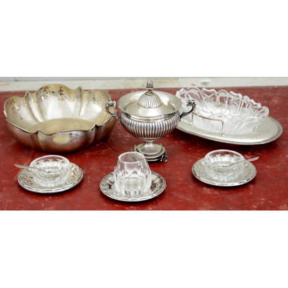 Lotto composto da una ciotola a bordo sagomato, una zuccheriera con coperchio, una salsiera e tre salierine con due cucchiaini, in argento e vetro (gr 730 ca)