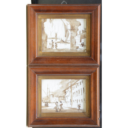 Coppia di acquerelli su carta raffiguranti personaggi entro paesaggi (cm 8,5x11) firmati in basso a destra. In cornici