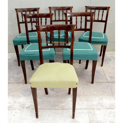 Gruppo di sei sedie con schienale decorato da colonnine tornite, gambe a sciabola