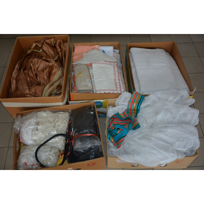 Lotto composto da cinque scatole contenenti tovaglie, centrini, copriletto, mantovane, una cintura e altro
