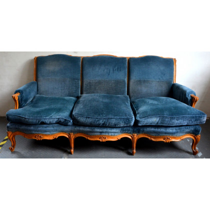 Divano a tre posti imbottito con schienale e montanti sagomati e scanalati. Fascia intagliata, piedi mossi (difetti)