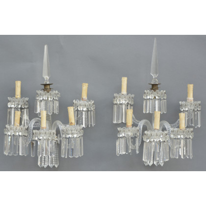 Coppia di appliques a quattro fiamme con braccia in vetro incolore decorato con pendenti in cristallo. Inizio sec. XIX (difetti e mancanze)