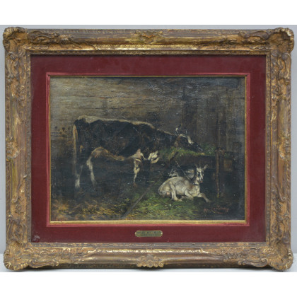 "Mucca e capra nella stalla" olio su tela (cm 28x38). Firmato in basso a destra A. Montemezzo