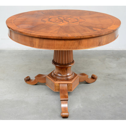Tavolo di forma tonda con piano filettato e intarsiato al centro da motivo a stella. Gamba centrale a colonna scanalata poggiante su mensola (cm 80x110) Sec. XIX (difetti e restauri)