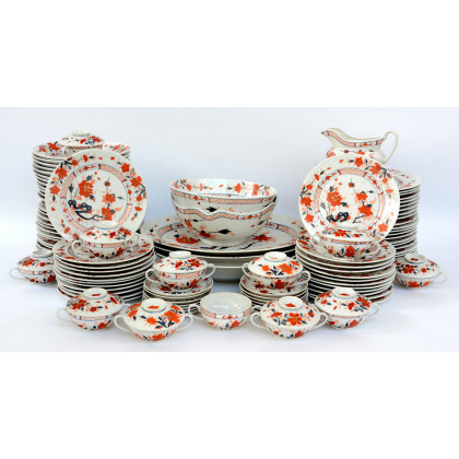 Manifattura orientale. Servizio di piatti in porcellana bianca decorata in policromia con rami fioriti composto da 35 piatti piani, 12 fondi, 24 piatti piccoli, 2 insalatiere, tre piatti da portata, 12 tazze, 14 ciotoline, 14 piattini, una salsiera e un vassoietto (difetti)