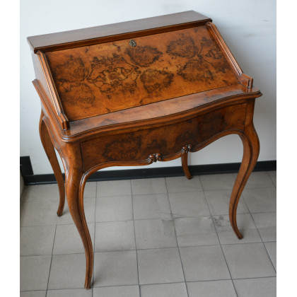Scrittoietto lastronato in radica con anta ribaltabile celante due cassettini e vani, cassetto nella fascia e gambe sagomate ( cm 78x95x57)