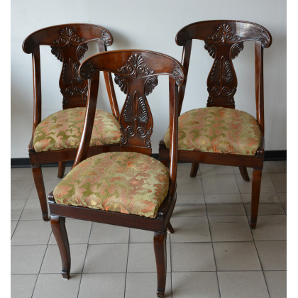 Gruppo di tre sedie a gondola in noce, schienale con cartella sagomata ed intagliata, gambe anteriori mosse e posteriori a sciabola (difetti)