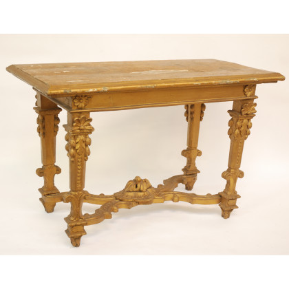 Tavolo da centro in legno dorato ed intagliato a fiori e volute, gambe decorate a riccioli unite da traversa centrata da elemento decorativo, sec. XVIII/XIX. Piano laccato a finto marmo (cm128x80x64) (difetti)